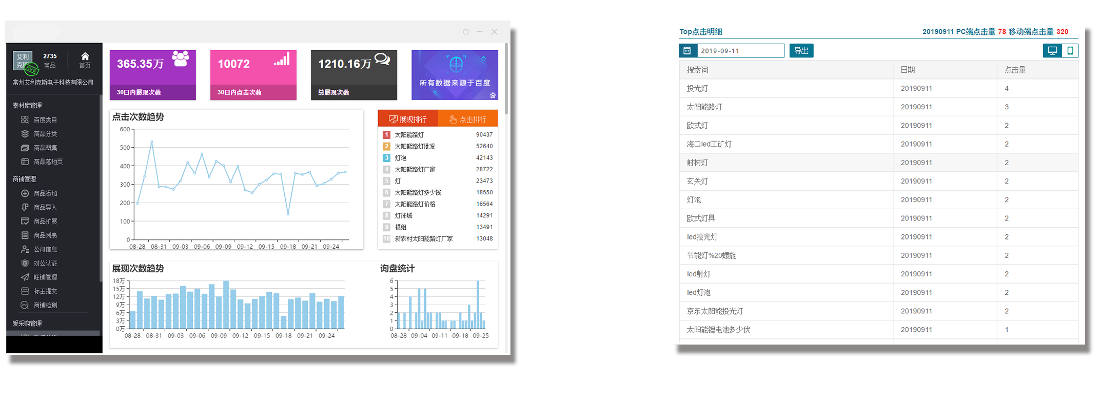 截止2019年9月9日,只百度愛采購平臺的曝光量已經累計1044.84萬,日點擊次數已經上百,詢盤量持續(xù)穩(wěn)定。